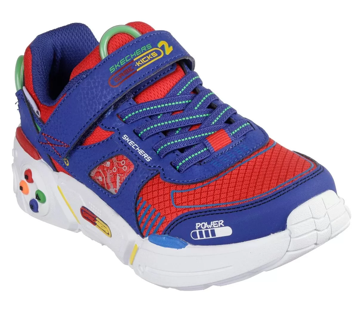 Step up the fun in awesome comfort with Skechers Game Kicks®: Gametronix 2.0. This lightweight game themed sneaker features a synthetic upper with stretch laces, Skechers adaptive closure, and a cushioned comfort insole.