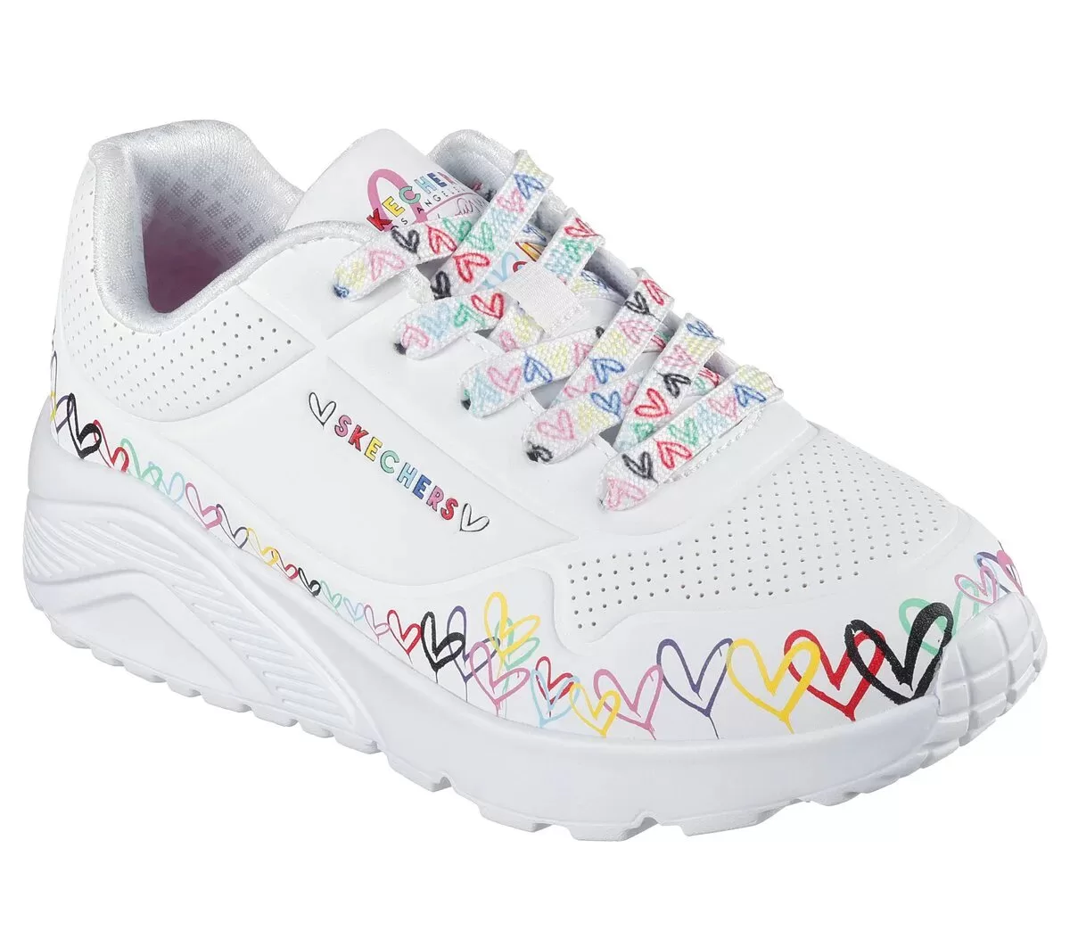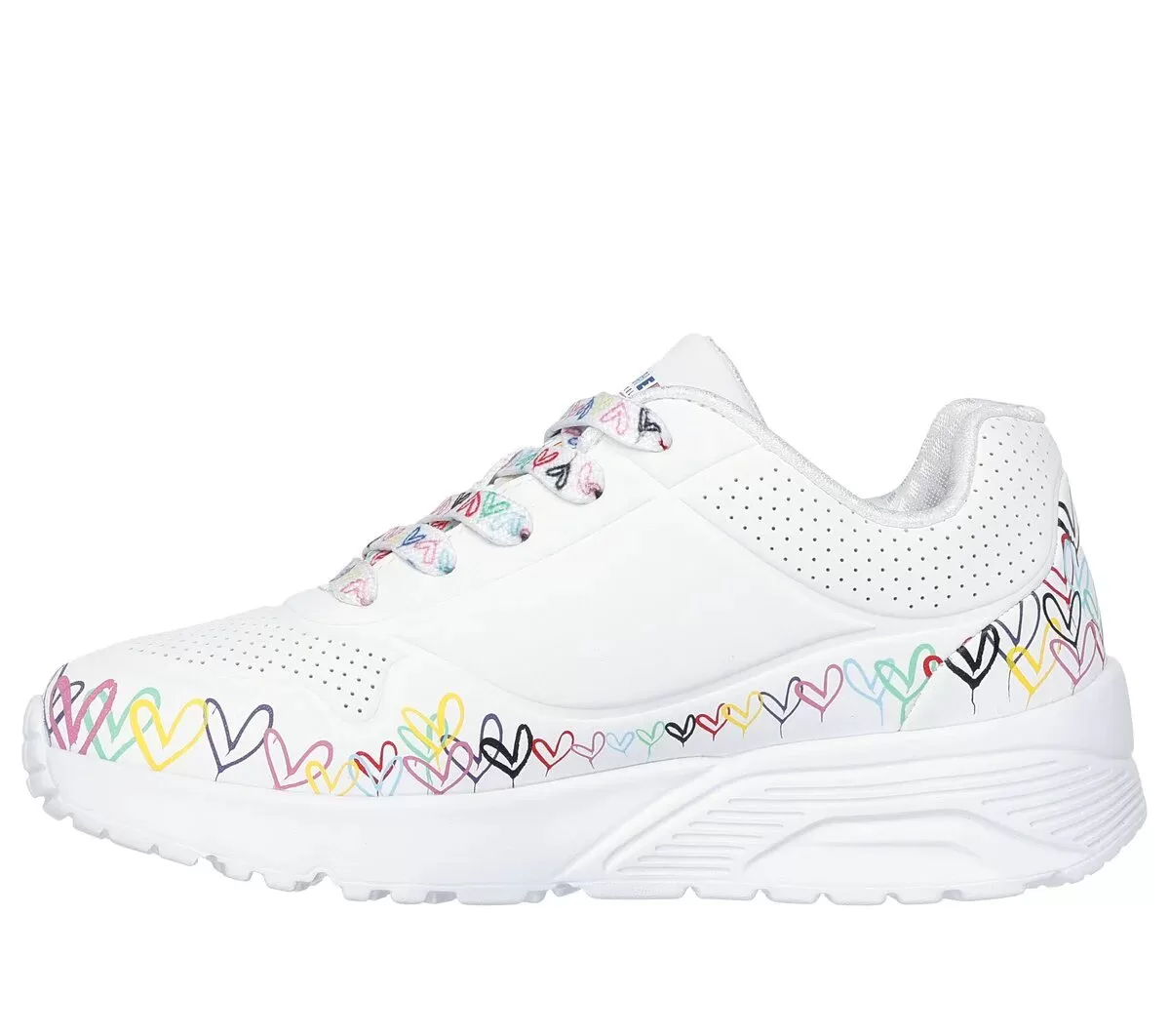 Internationally renowned muralist James Goldcrown brings his iconic #Lovewall heart designs to Skechers in this inspiring collaboration. Show your creative style with Skechers Street™ x JGoldcrown: Uno Lite – Heart Daze. This lace-up fashion sneaker features a print of the artist’s signature heart design, synthetic durabuck and perforated trimmed upper with a Skechers Air-Cooled Memory Foam® insole.