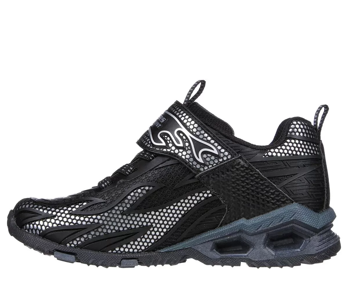 Fiery style and sporty comfort combine in Skechers S-Lights®: Hydro Lights – Heat Stride. This durable light-up design features a water-repellent 3D synthetic upper with a stretch-lace front, adjustable instep strap, and shock-absorbing contoured midsole.