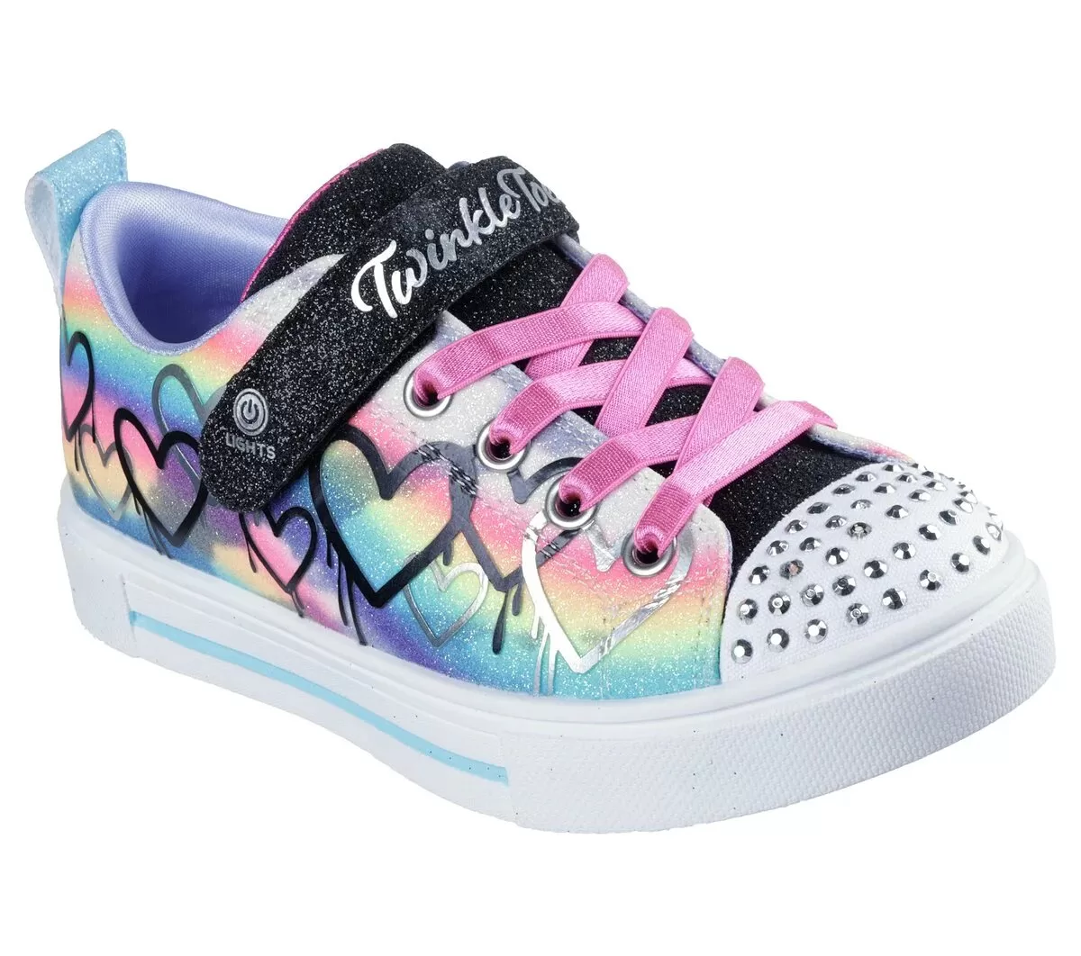 Light up the playground with heart-filled style wearing Skechers Twinkle Toes®: Twinkle Sparks – Ombre Love. This fun light-up sneaker features a metallic drip heart print fabric upper with glitter trim, satin stretch laces, adjustable instep strap, and a light-up rhinestone embellished toe.