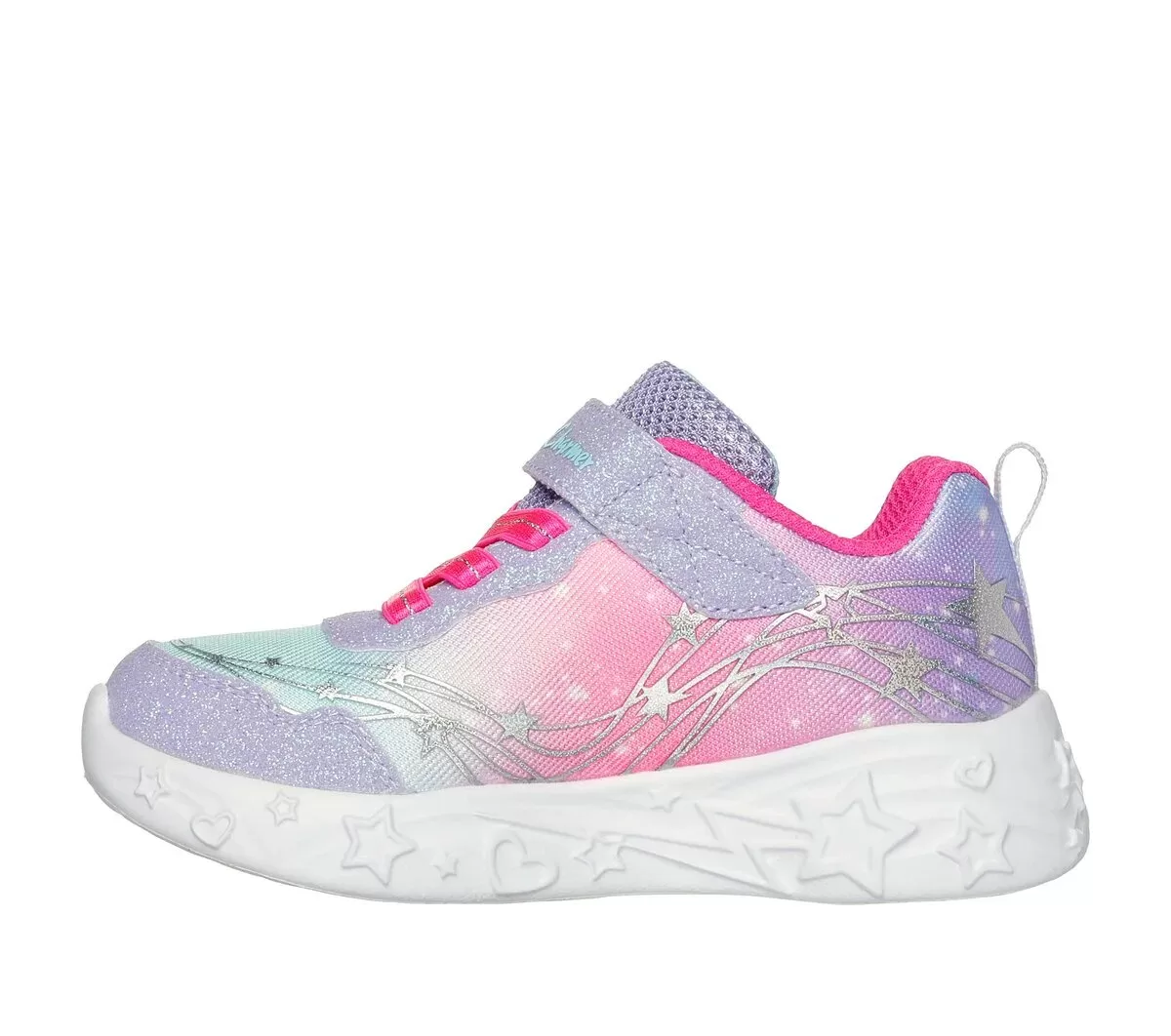 Brighten up their steps with a little unicorn magic in Skechers Unicorn Charmer – Lil Stellar. This light-up design features an ombre sheen mesh upper with star foil print, a light-up sculpted unicorn midsole and a cushioned comfort insole.