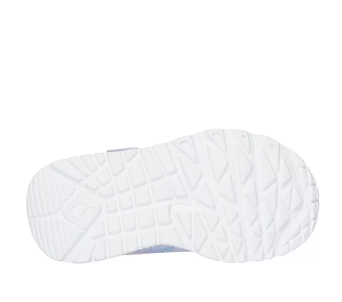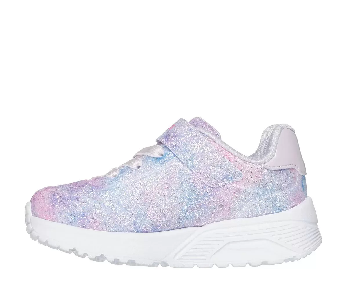 Enjoy galactic style with out-of-this-world comfort wearing Skechers Street™ Uno Lite – Cloudy Spell. This Skechers adaptive closure fashion sneaker features a colorful, glitter-covered durabuck upper with stretch laces, an adjustable instep strap, and a cushioned comfort insole.