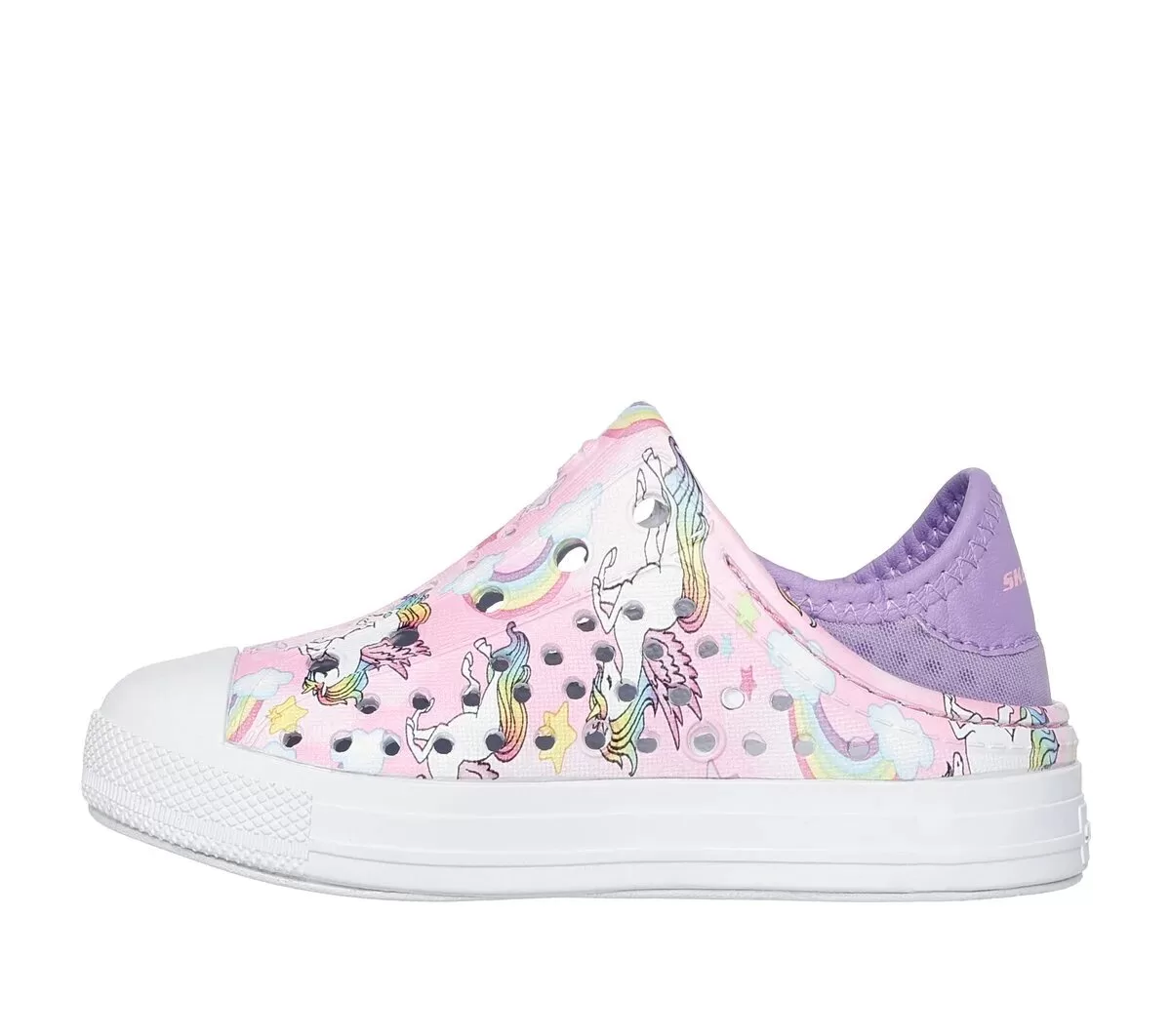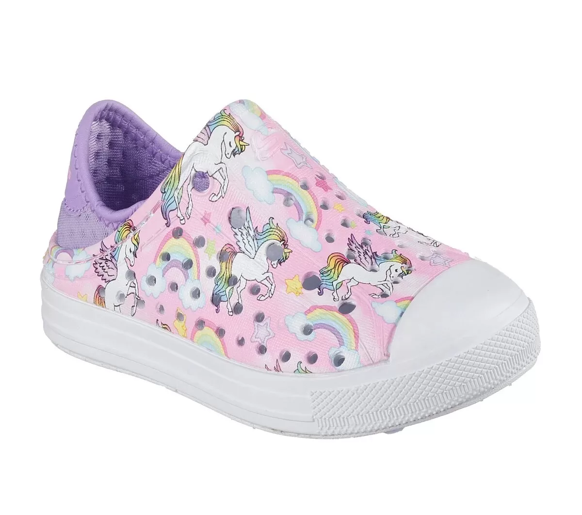 Soar into magical fun and comfort wearing Skechers Foamies®: Guzman Steps. This water-friendly design features a perforated unicorn print Foamies® EVA upper with a collapsible neoprene heel and a cushioned comfort footbed.