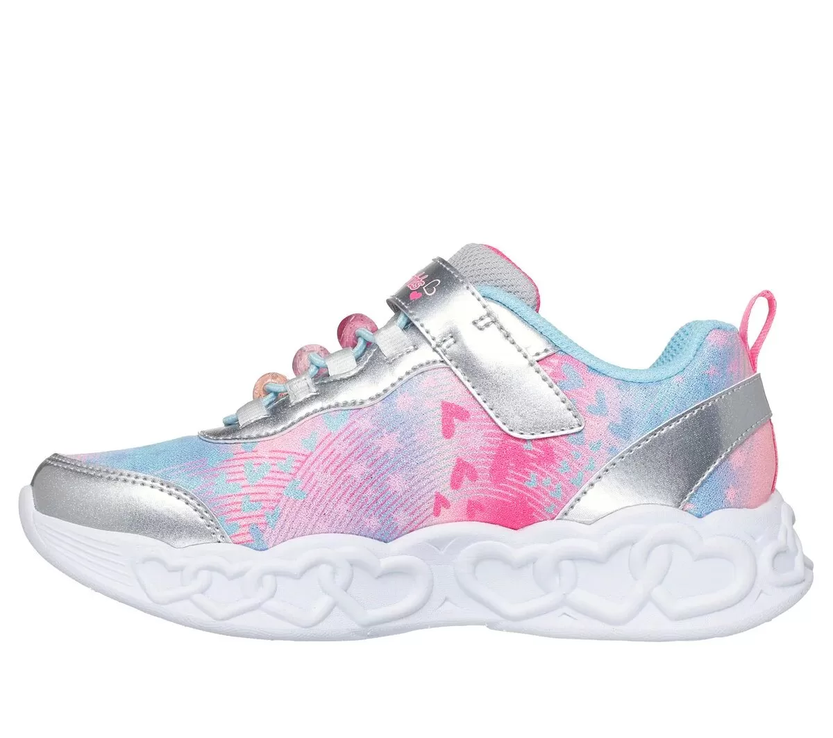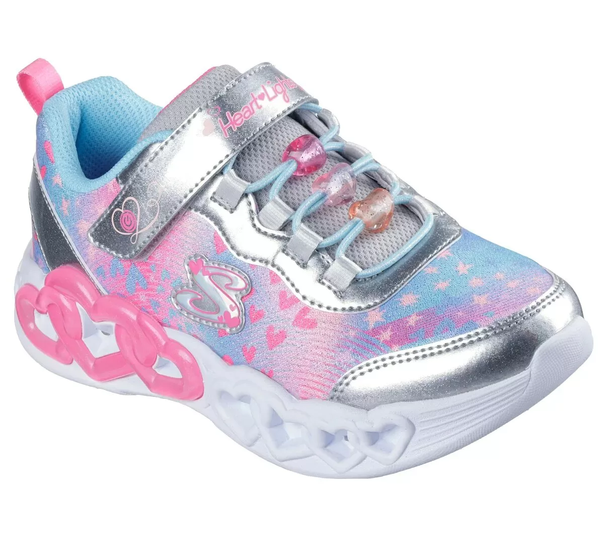 Sparkle and shine in magical delight wearing Skechers Heart Lights® Infinite Heart Lights – Heart Jewels. This Skechers adaptive closure design features a heart-and-star print sparkle mesh upper with synthetic overlays, fixed stretch laces with heart charms, an adjustable instep strap, and a sculpted light-up midsole with ‘heart chain’ detail.