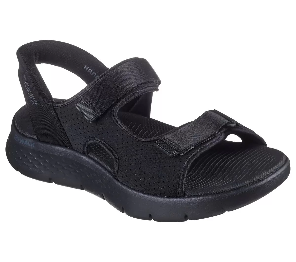 Experience an effortless way to wear your favorite sport sandal with Skechers Hands Free Slip-ins®: GO WALK Flex™ Sandal – Easy Entry. Designed with our Heel Pillow™, this strappy athletic sandal features a woven upper with an adjustable instep strap, a contoured Goga Mat® footbed, lightweight ULTRA GO® cushioning, and a Skechers Hands Free Slip-ins® back heel.