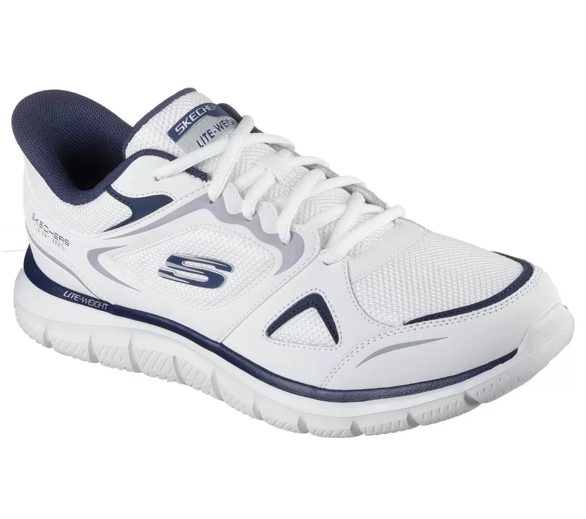 Train in lightweight comfort and sporty style wearing Skechers Hands Free Slip-ins®: Track – Ezral. Designed with our exclusive Heel Pillow™, this sleek style features a mesh upper with leather and synthetic overlays, adjustable laces, and a cushioned Skechers Air-Cooled Memory Foam® insole.