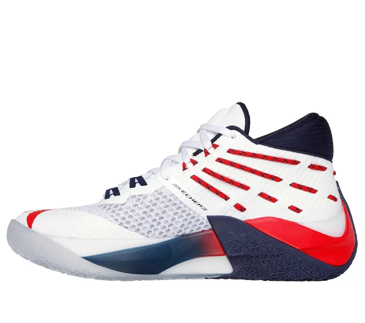 Take your game to the next level with Skechers Basketball®: SKX REIGN™, footwear engineered to promote a quick first step, speed, and intense traction. This mid-top lace-up features a comfort collar, lock-down heel, and a strategically-placed mid-foot wrap for players who prefer more stability. The design is enhanced with a resilient Skechers HYPER BURST PRO™ sock liner, a dual-density Skechers HYPER BURST® midsole, a carbon-infused plate for explosive take-offs, and a Goodyear® Performance Outsole for superior grip and long-lasting durability.
