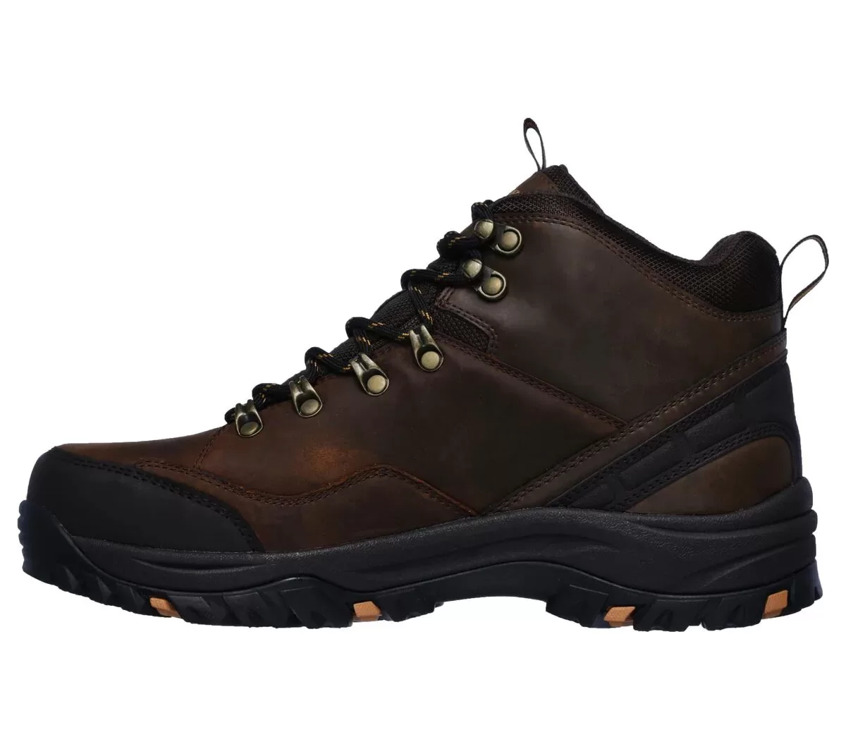Forge ahead in rugged trail-ready style and comfort with Skechers Relaxed Fit®: Relment – Traven. This lace-up hiking style ankle boot features a waterproof durable smooth leather, synthetic and mesh upper with cushioned Memory Foam insole.