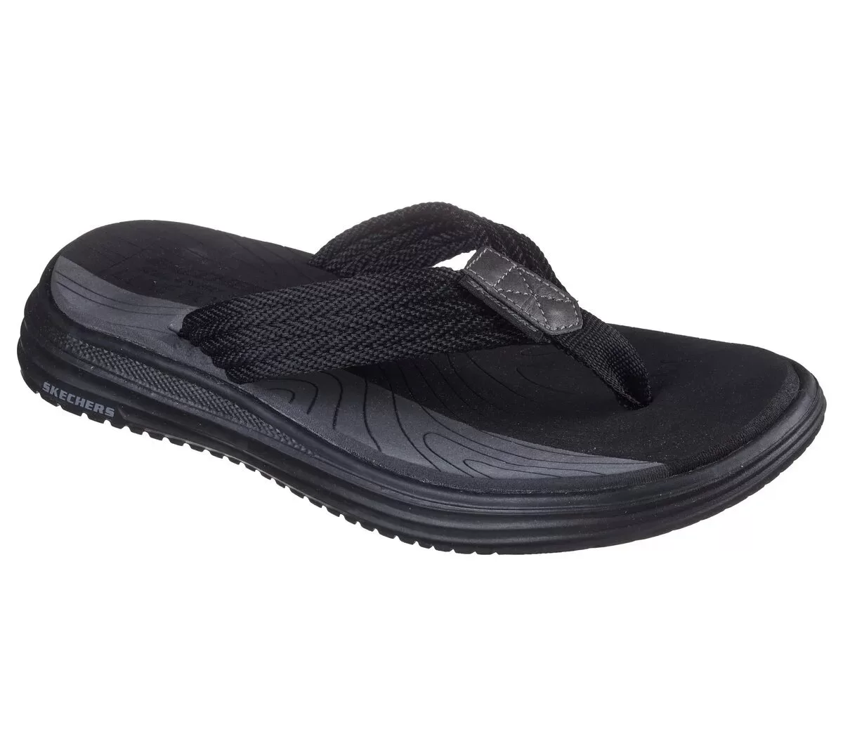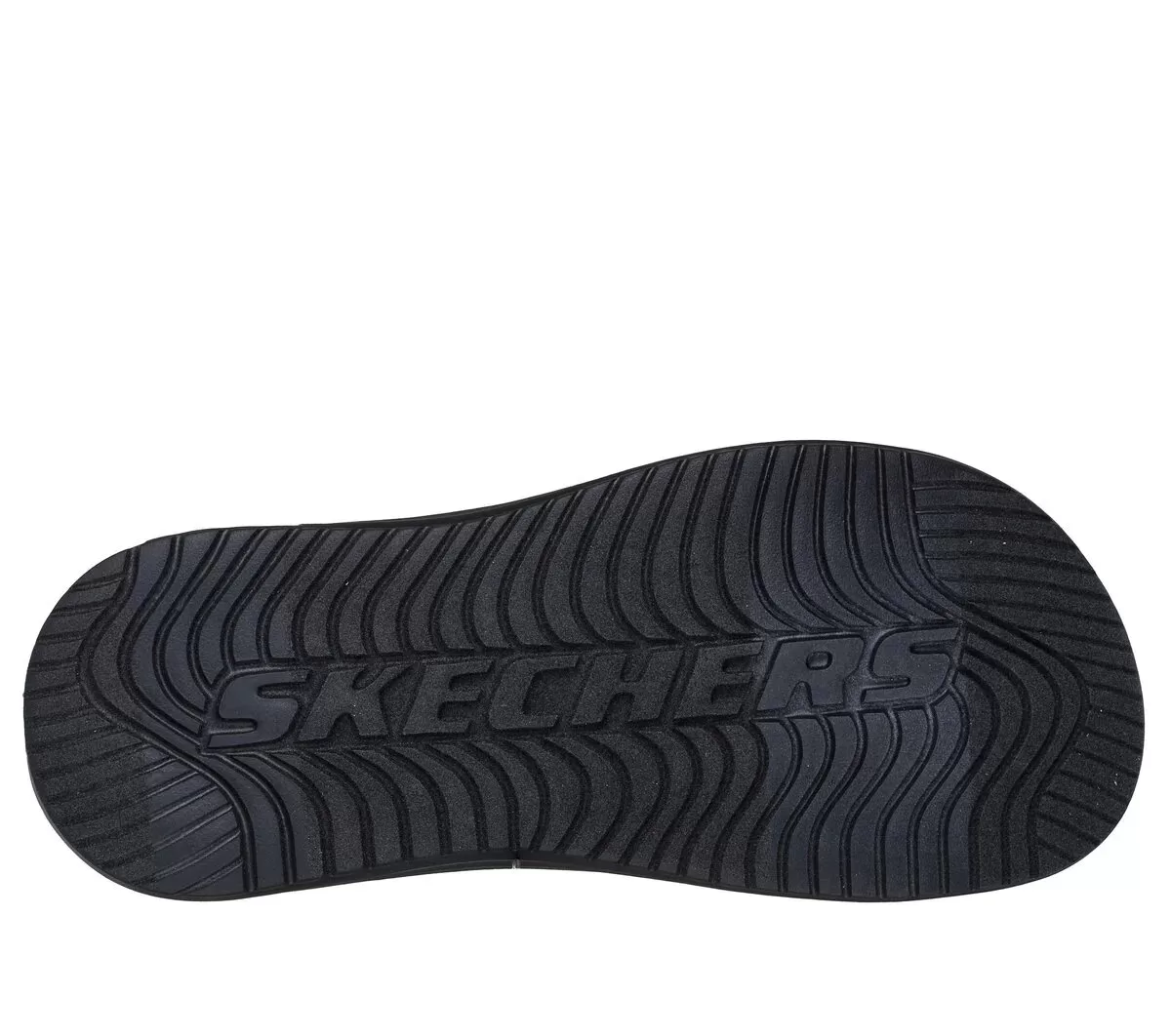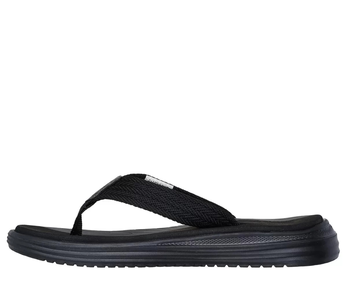 Bring on the sand, surf, and sun in Skechers Relaxed Fit®: Proven SD – Korey. This roomy 3-point thong sandal features a woven webbed upper and a contoured Luxe Foam® footbed.