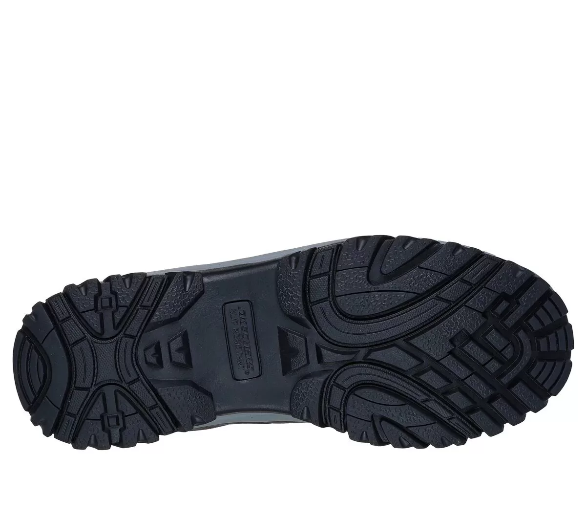 Well-weathered comfort and safety deliver in Skechers Work™: Relment – Erett CT. This waterproof hiker-inspired lace-up features a leather and woven fabric upper with a cushioned Skechers Air-Cooled Memory Foam® insole and composite safety toe.