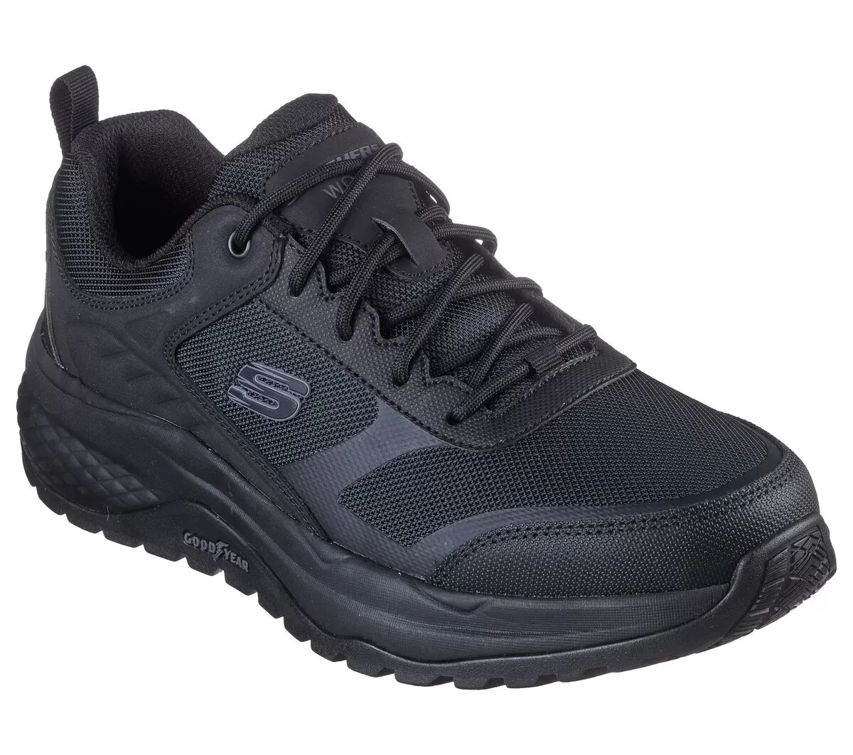 Gear up for your shift in exceptional traction and supportive comfort with Skechers Work™: Street Treader. This slip-resistant lace-up features a leather, synthetic and mesh upper with a cushioned Skechers Air-Cooled Memory Foam® insole, and a highly durable Goodyear® Rubber Outsole.