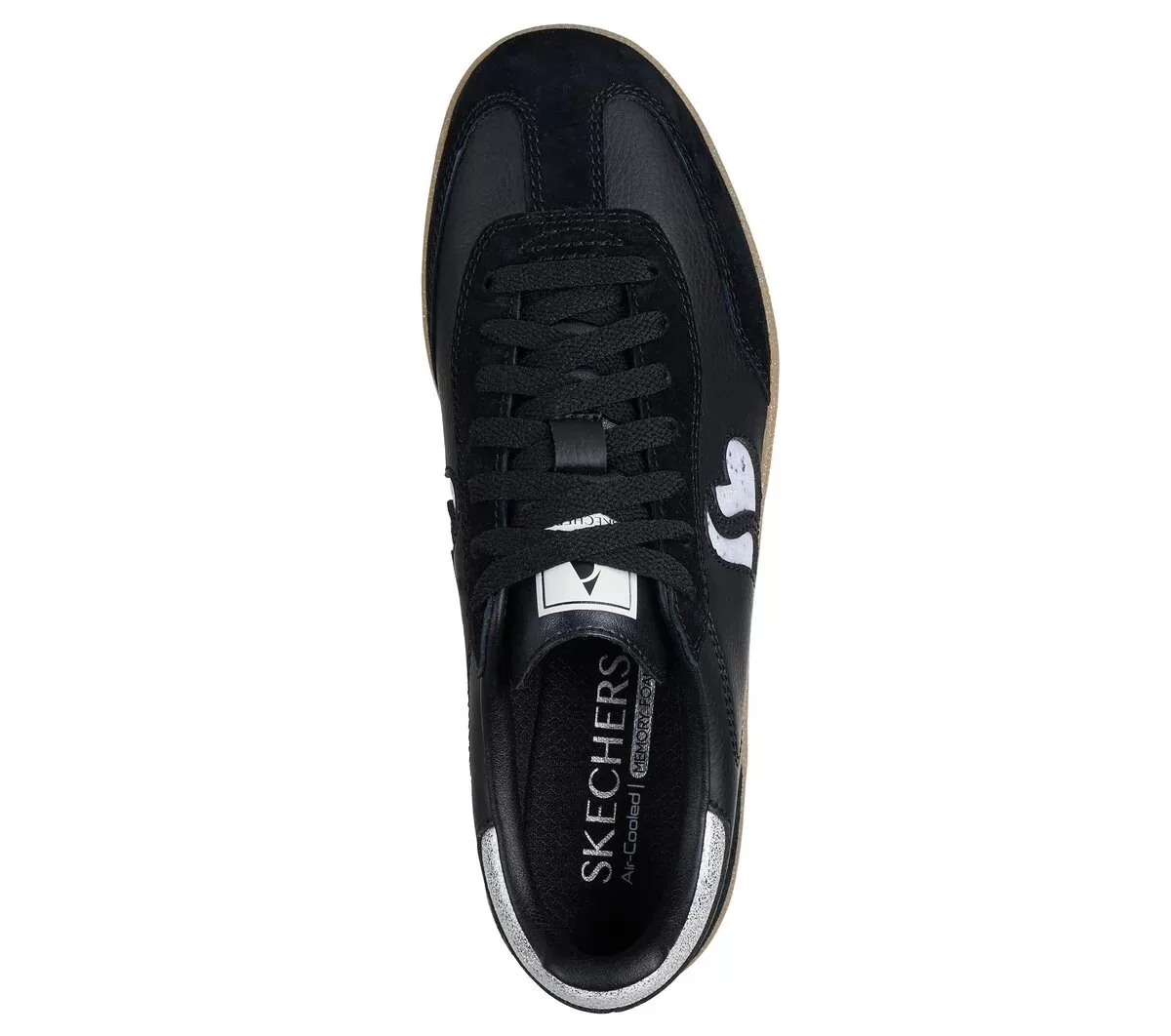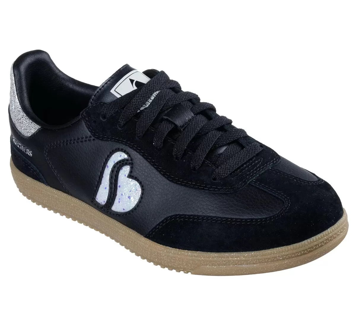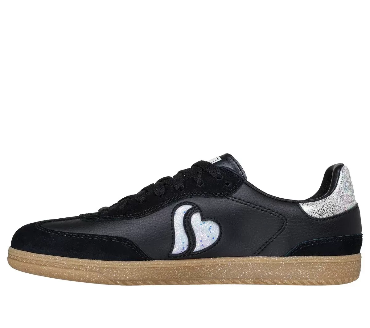 Feel the love of comfort in sparkling fashion wearing Skechers Hotshot – Electric Heart. This lace-up court-style sneaker features a duraleather and suede overlay upper with glitter-embellished S-heart quarter detail and a cushioned Skechers Air-Cooled Memory Foam® insole.