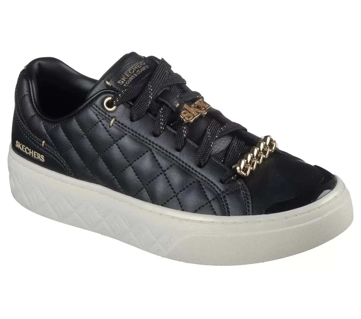 Turn up the style and the comfort wearing Skechers Rubie – Quilted Love. This fashion court lace-up features a quilted duraleather upper with removable lace charms and our signature Air-Cooled Memory Foam® insole.