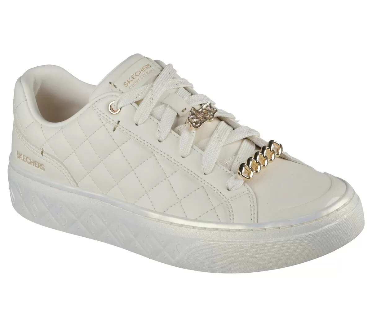 Turn up the style and the comfort wearing Skechers Rubie – Quilted Love. This fashion court lace-up features a quilted duraleather upper with removable lace charms and our signature Air-Cooled Memory Foam® insole.