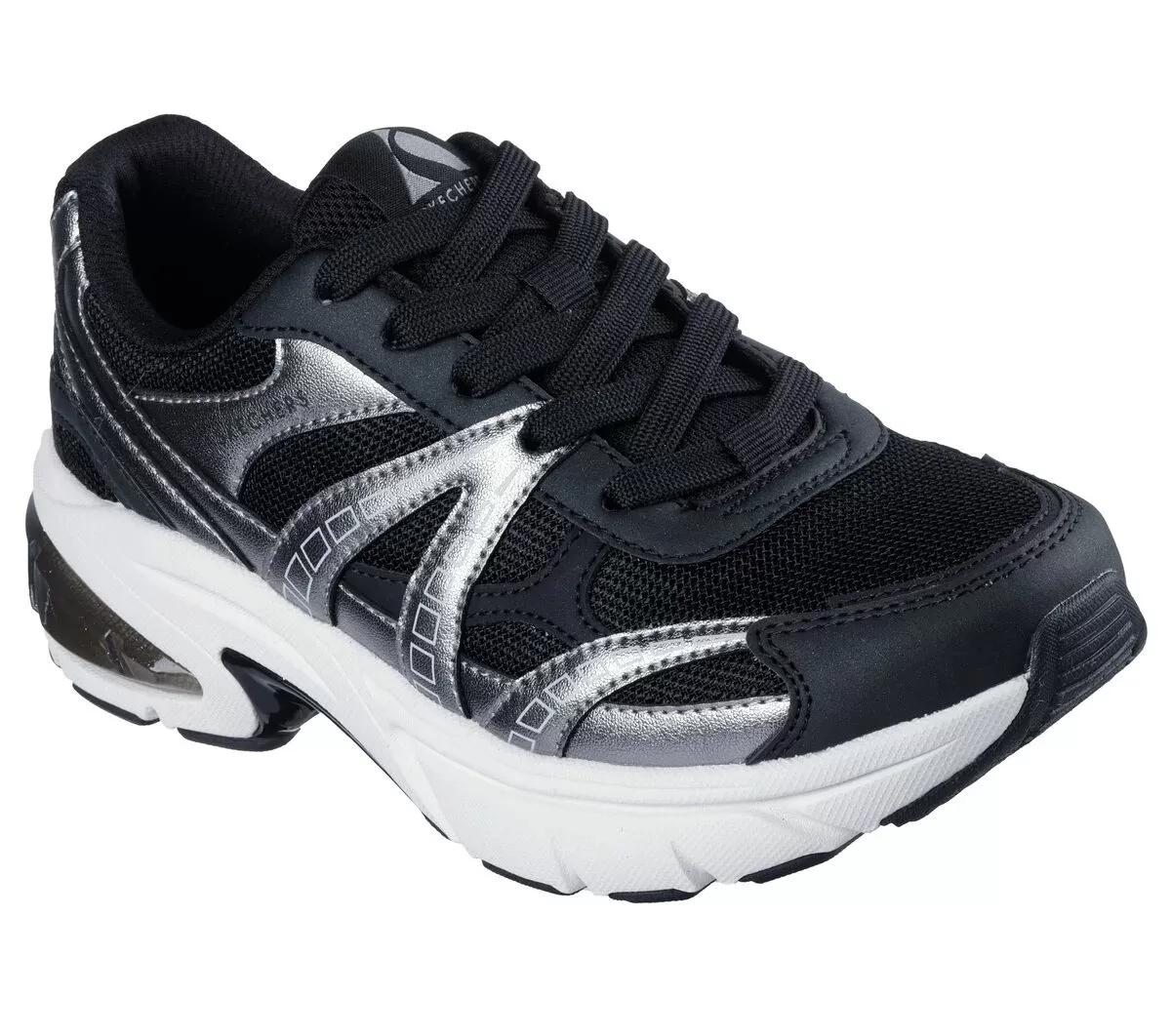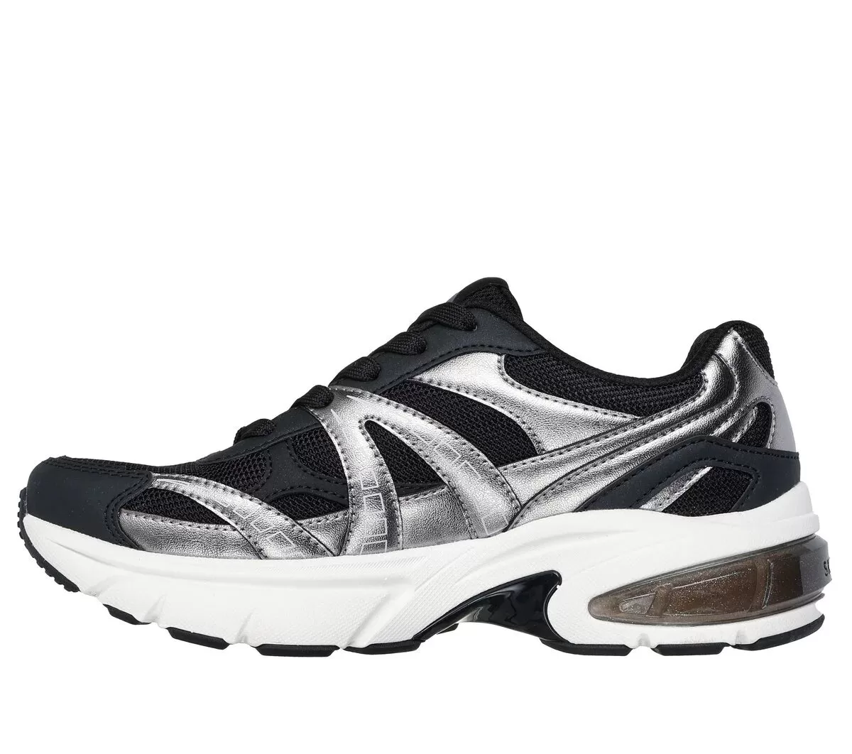 Show off your sporty diva style wearing Skechers Street™ Skechers Shadow – Stellar 90. This lace-up fashion sneaker features a metallic duraleather and mesh upper with a translucent midsole insert and cushioned Skechers Air-Cooled Memory Foam® insole.