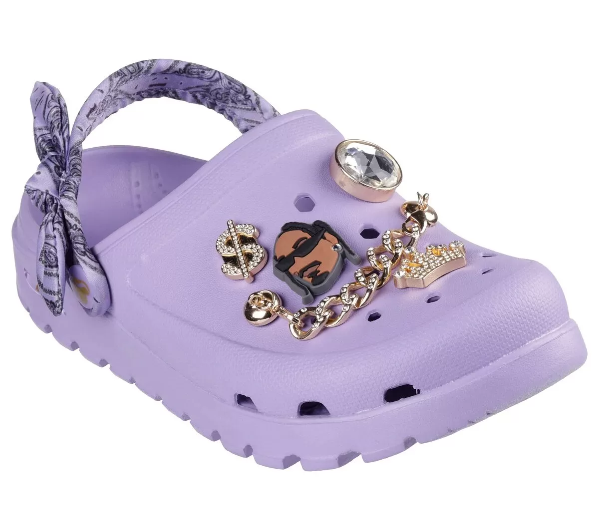 Haute Drop: Rep the D-O-Double-G in G-glam style wearing Skechers x Snoop Dogg: Arch Fit® Footsteps – Rolling Glitz. This head-turning fashion clog features a breathable EVA upper with removable Snoop-themed charms, a satin bandana-wrapped convertible heel strap with bow accent, and a contoured Arch Fit® footbed.