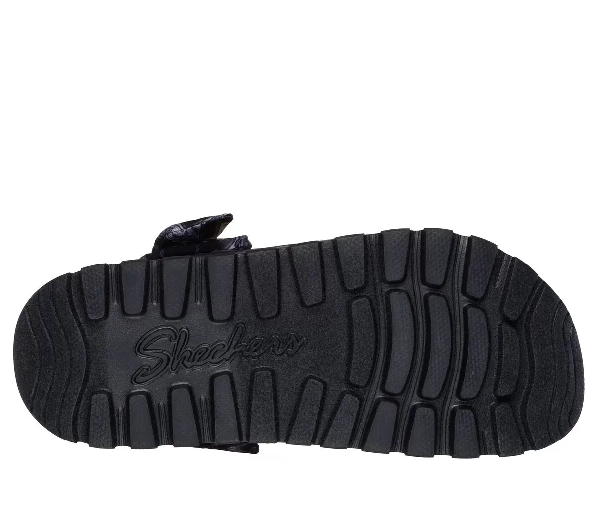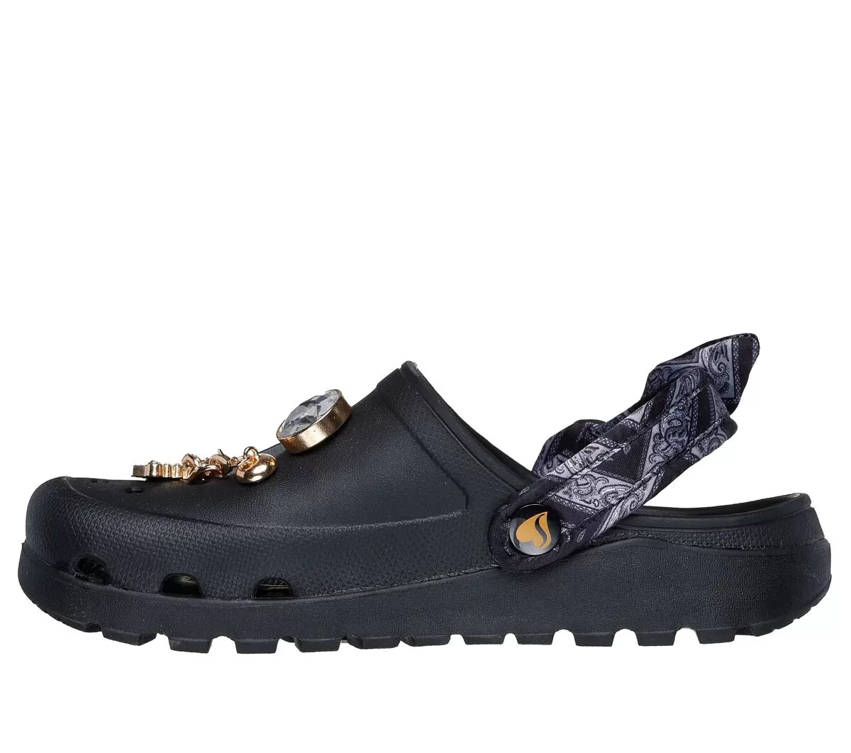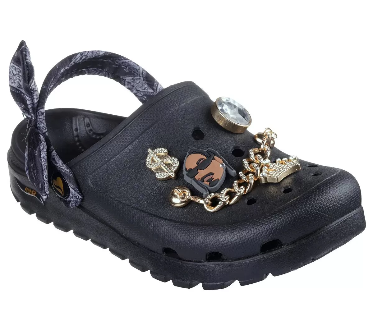 Haute Drop: Rep the D-O-Double-G in G-glam style wearing Skechers x Snoop Dogg: Arch Fit® Footsteps – Rolling Glitz. This head-turning fashion clog features a breathable EVA upper with removable Snoop-themed charms, a satin bandana-wrapped convertible heel strap with bow accent, and a contoured Arch Fit® footbed.