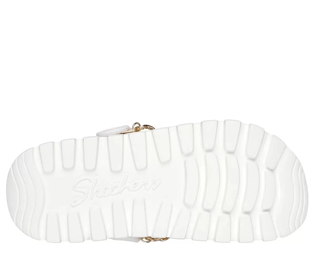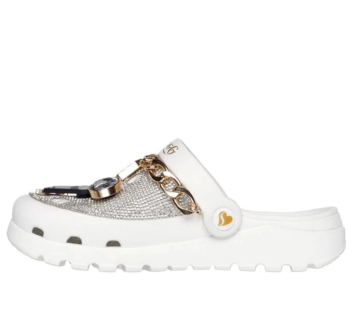 Haute Drop: Rep the D-O-Double-G in glammed up comfort wearing Skechers x Snoop Dogg: Arch Fit® Footsteps – Rolling N Gold. This head-turning fashion clog features a rhinestone-embellished EVA upper with gold chain detail, removable Snoop-themed charms, and a contoured Arch Fit® footbed.