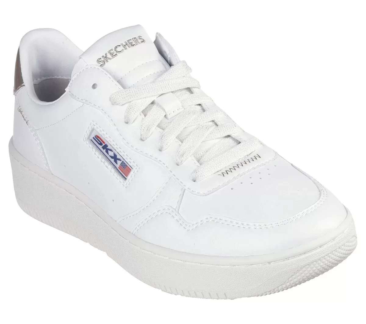 Casual modern style and effortless comfort combine in Skechers Sport Court 2.0 – Gleaming Shine. This a sleek court silhouette features a lace-up duraleather upper with a metallic trim and a cushioned Skechers Air-Cooled Memory Foam® insole.