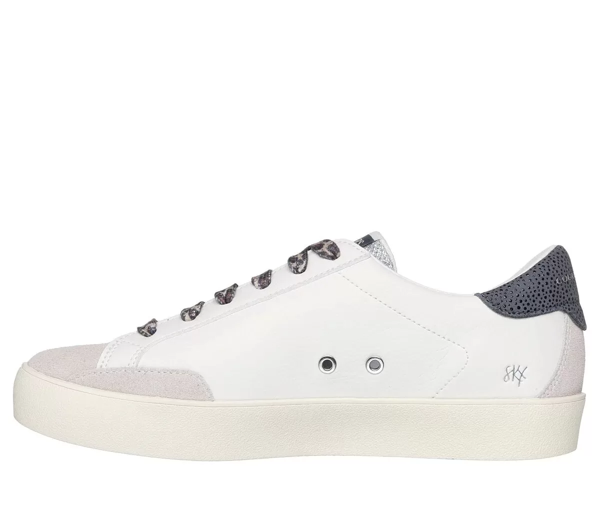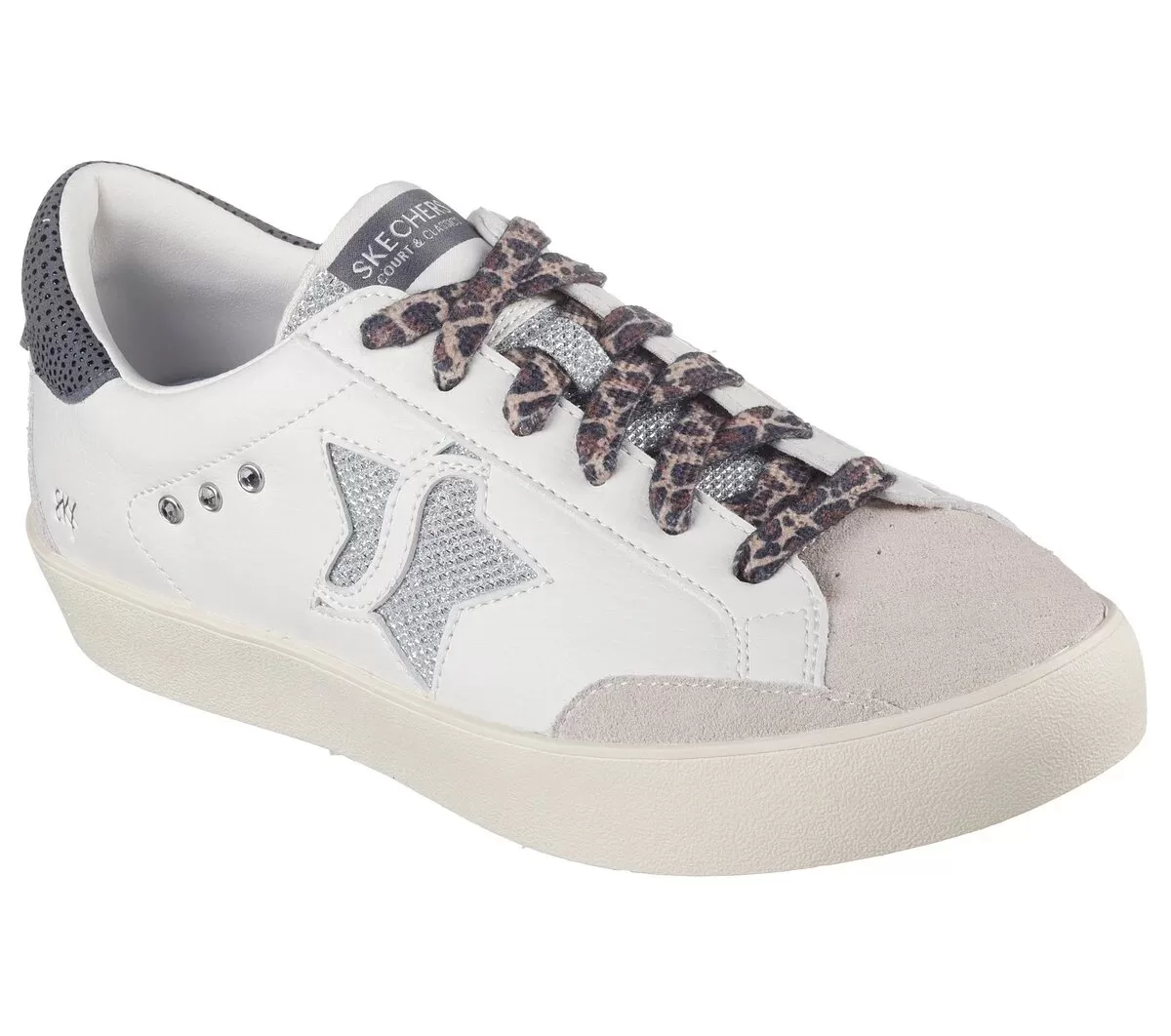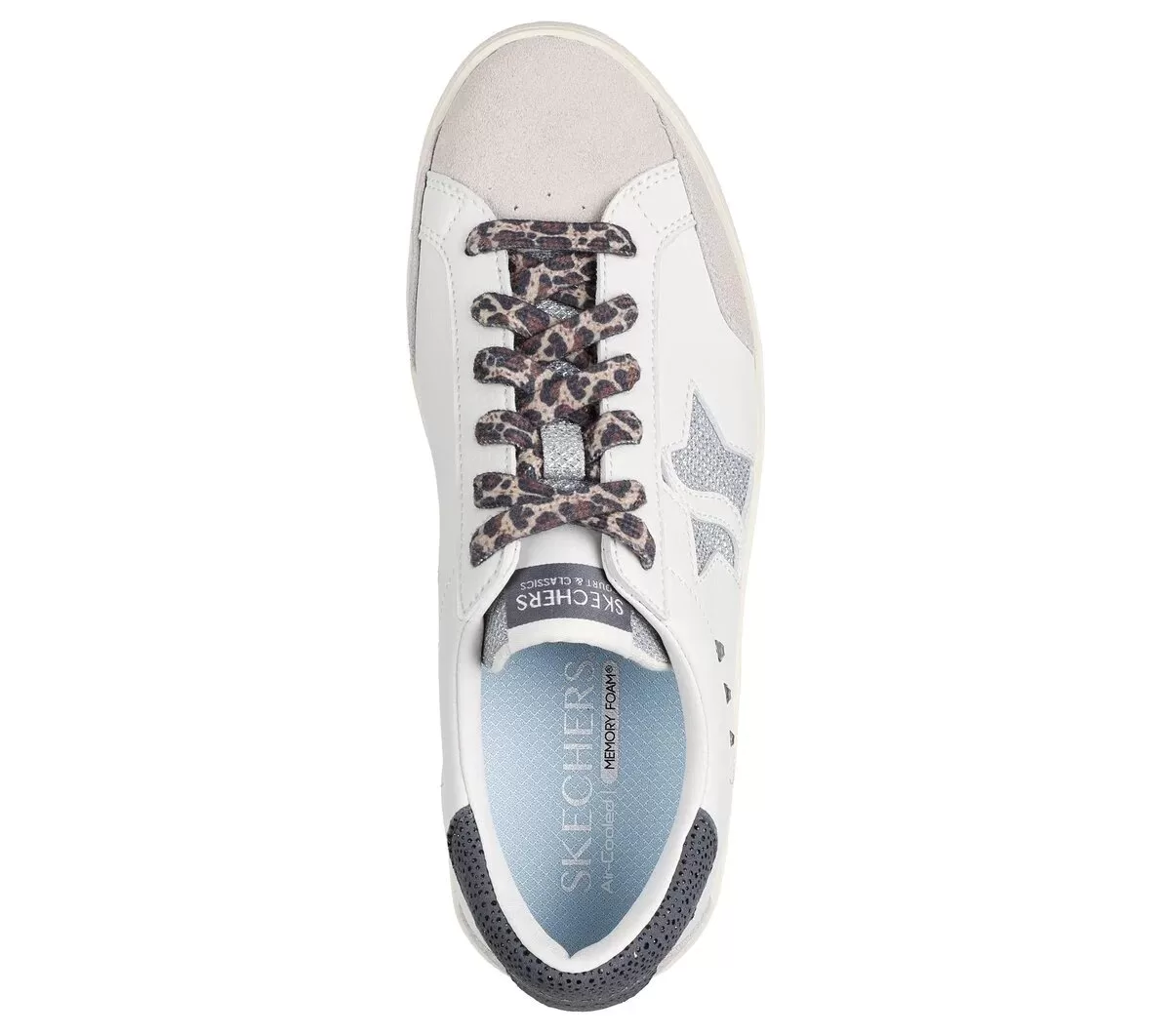 Find your star power style with uncompromising comfort wearing Skechers Strand Star – Fierce Statement. This low-top fashion lace-up features a duraleather and suede overlay upper with star and rhinestone quarter details, a Skechers Air-Cooled Memory Foam® cushioned insole, and court-style midsole with hidden heel wedge.