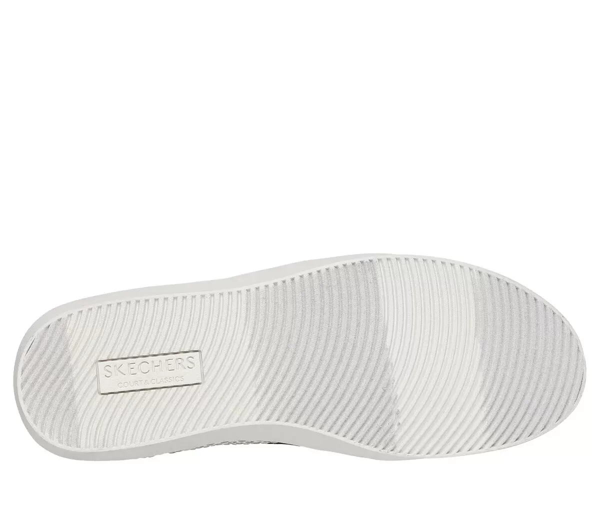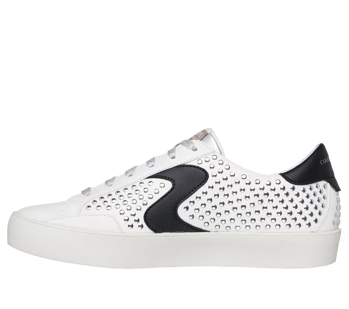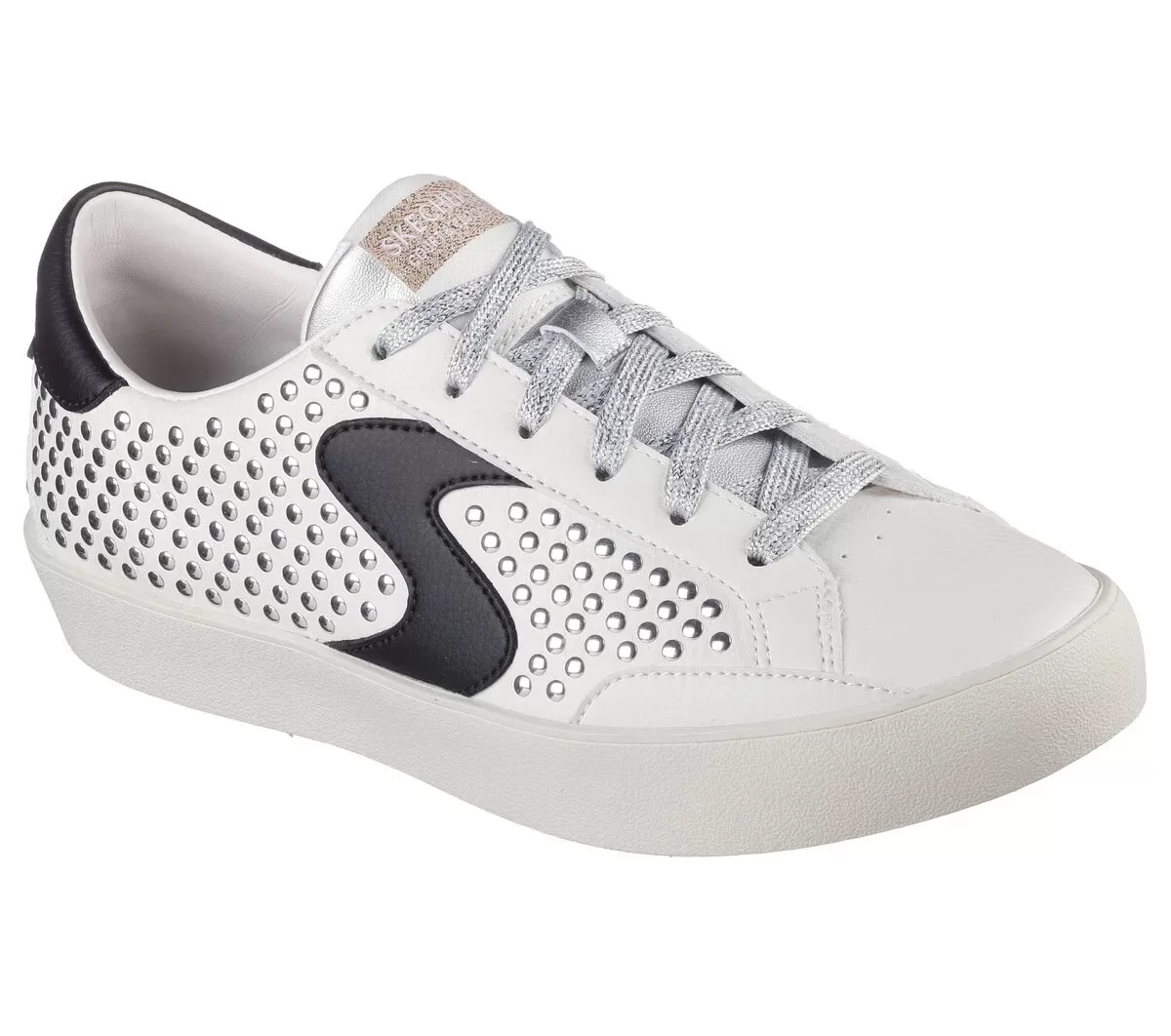 Find your star power style with uplifting comfort wearing Skechers Strand Star – Studded Dreams. This low-top fashion lace-up features a studded duraleather upper with contrast detail, a court-style midsole with hidden heel wedge, and a Skechers Air-Cooled Memory Foam® cushioned insole.
