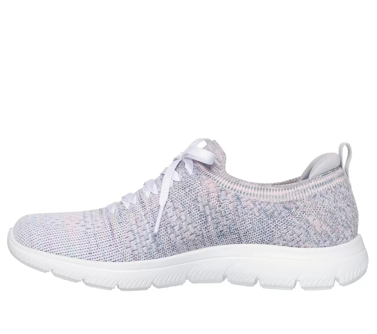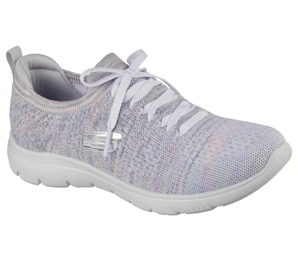 Step out in sporty style and easy-wearing comfort with Skechers Summits – Sweet Glow. This casual vegan design features a Stretch Fit® engineered knit upper with a metallic Space Dye finish, fixed deco laces, and a cushioned Skechers Memory Foam™ insole.