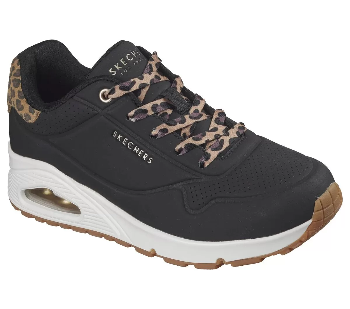 Walk on air in the wildly comfortable Skechers Street™ Uno – Jungle Nite. This lace-up fashion sneaker features a synthetic upper with leopard print heel mustache, a Skechers Air-Cooled Memory Foam® insole, and a Skech-Air® visible air-cushioned midsole.