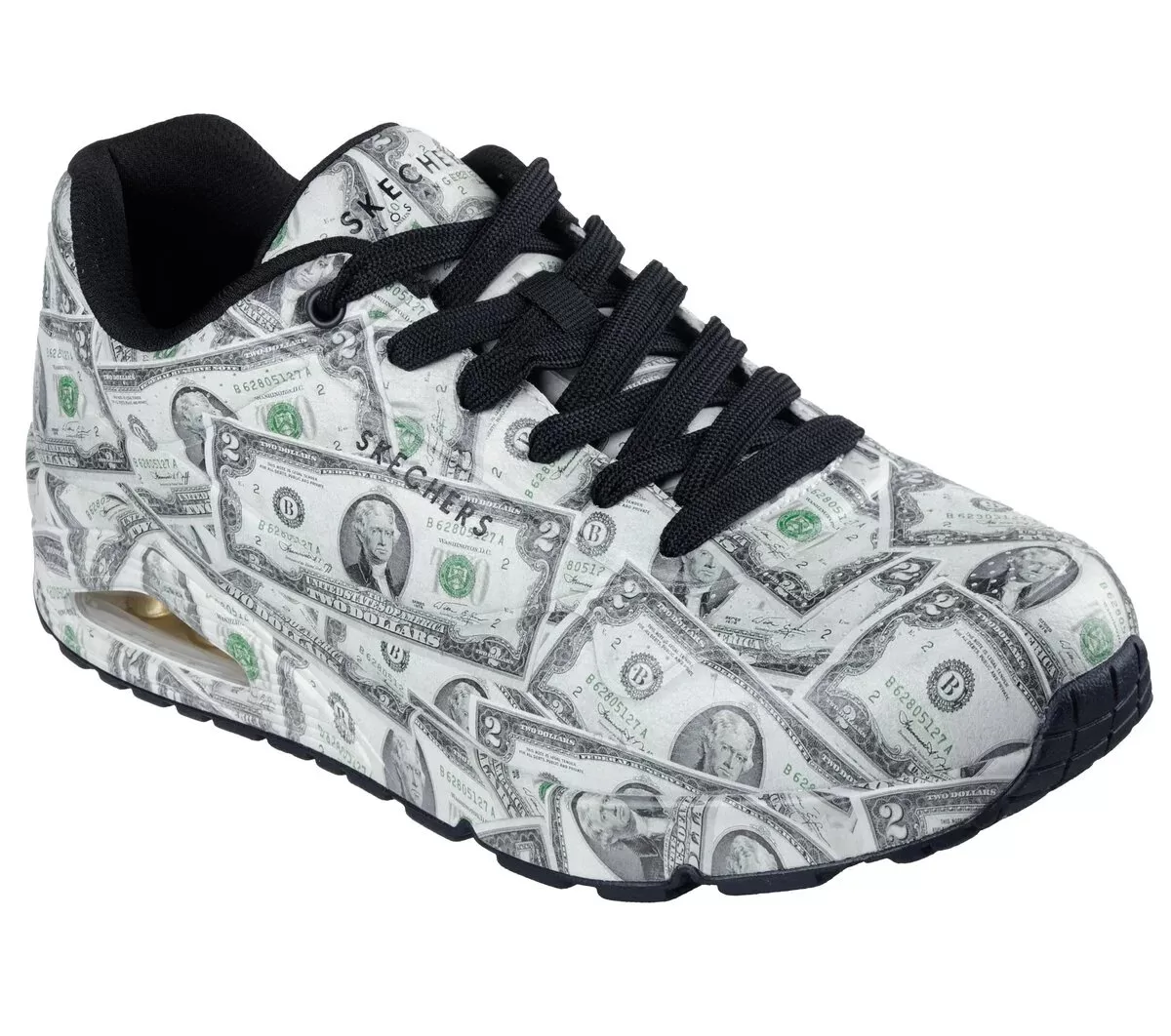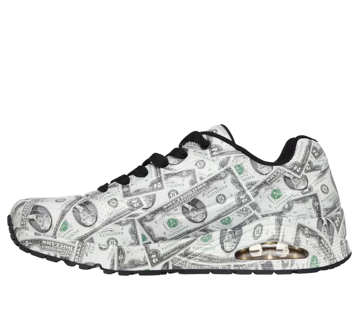 Feel like a million bucks with every step wearing Skechers Street™ Uno – Raining Money. This lace-up fashion sneaker features a duraleather upper with an allover $2 bill print, translucent Skech-Air® airbag midsole, and a Skechers Air-Cooled Memory Foam® insole for on-the-money comfort.