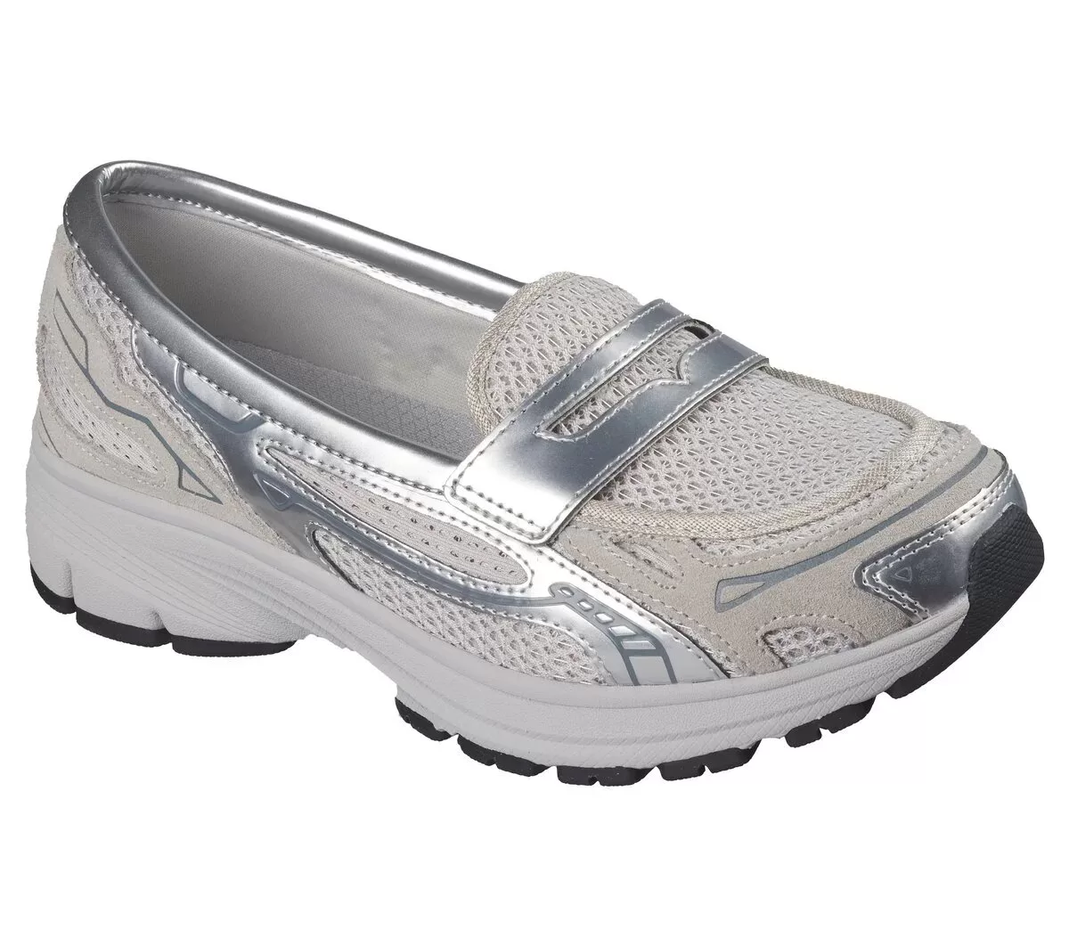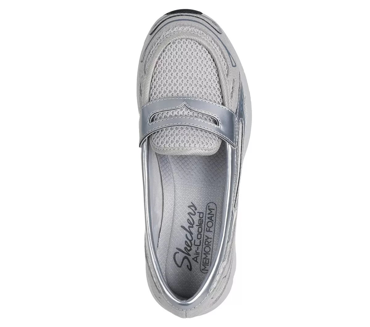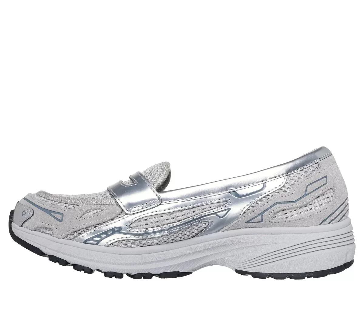 Let your sporty side shine in casual comfort with Skechers Var-City. This easy-on vegan loafer features a mesh and duraleather upper with metallic accents and a Skechers Air-Cooled Memory Foam® insole.