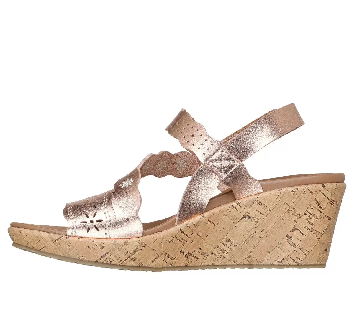 Step out with style and absolute comfort in Skechers Cali® Beverlee – Cherished Aura. This strappy slingback sandal features a laser cut vegan leather upper with embroidery detail, hook-and-loop closure, a cork veneer wedge midsole, and a cushioned Luxe Foam® footbed.