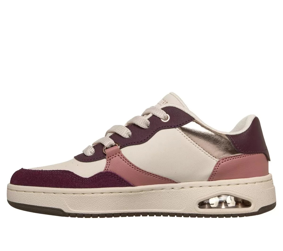 Lace into standout style and superior comfort with Skechers Street™ Uno CTL – Subtle Shimmer. This court-style fashion design features a laced duraleather and suede overlay upper with metallic detail, a cushioned Air-Cooled Memory Foam® insole, and a visible Skech-Air® airbag midsole.