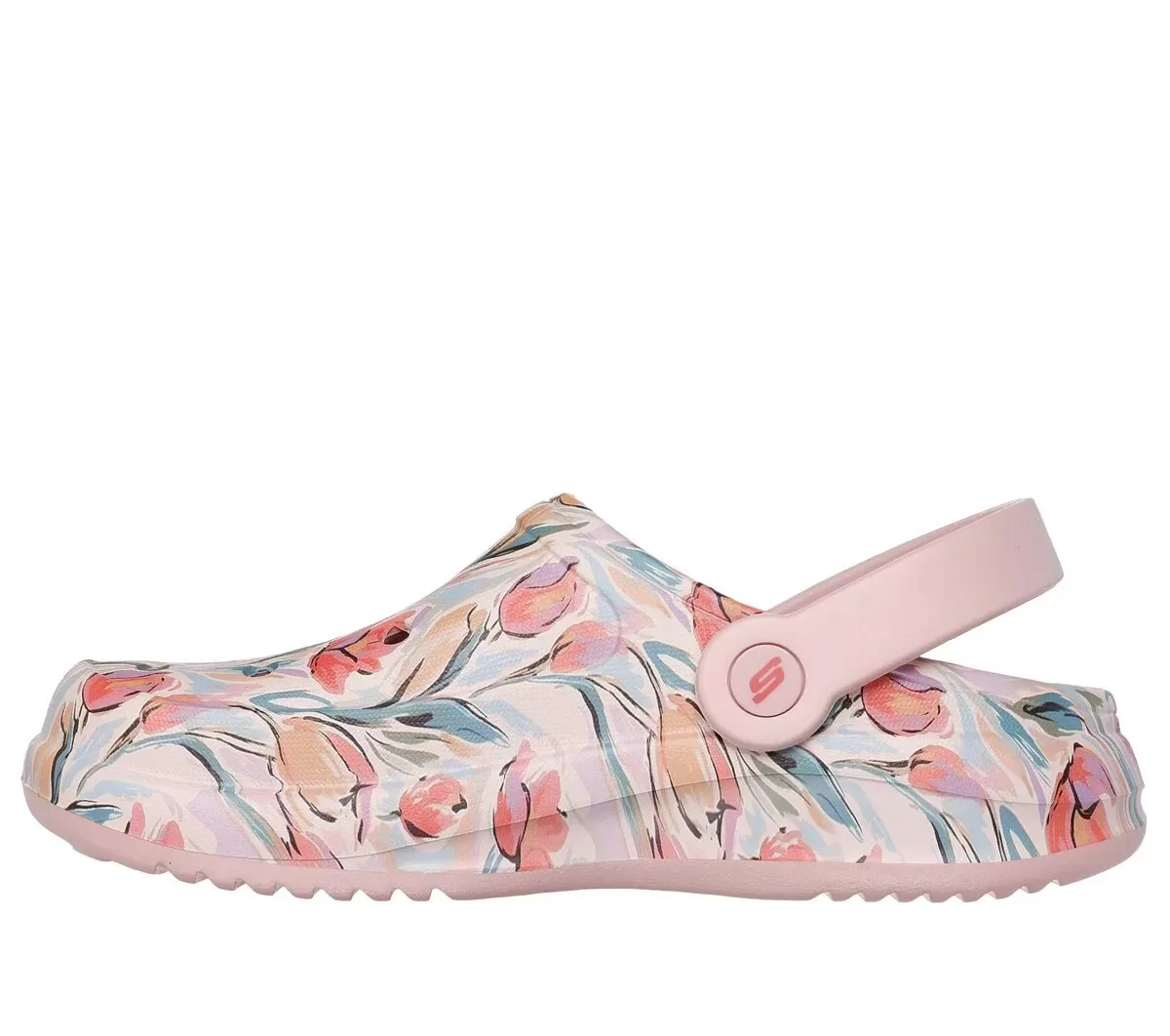 Petal in for style wearing Skechers Foamies®: Blooming. This slip-on clog features an allover floral printed EVA foam upper with a convertible heel strap, and cushioned comfort footbed.