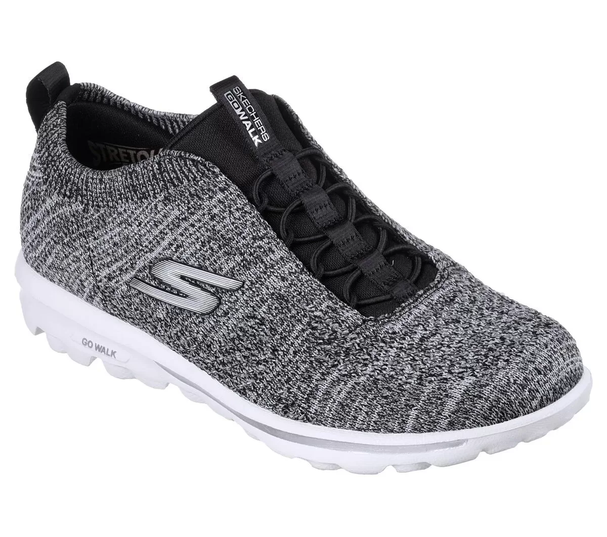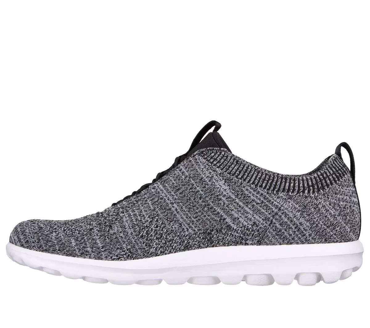 Breeze through your daily walks in easygoing comfort with Skechers GO WALK® Travel – Radiant Moon. Featuring a heathered knit upper with stretch laces, a Skechers Air-Cooled Goga Mat™ insole, and lightweight ULTRA GO® cushioning.
